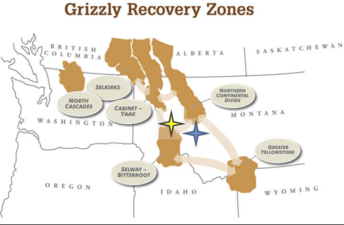 The Brock Creek (blue star) and Nellie Creek (yellow star) help connect federally designated grizzly bear recovery zones. Map graphic by Vital Ground.